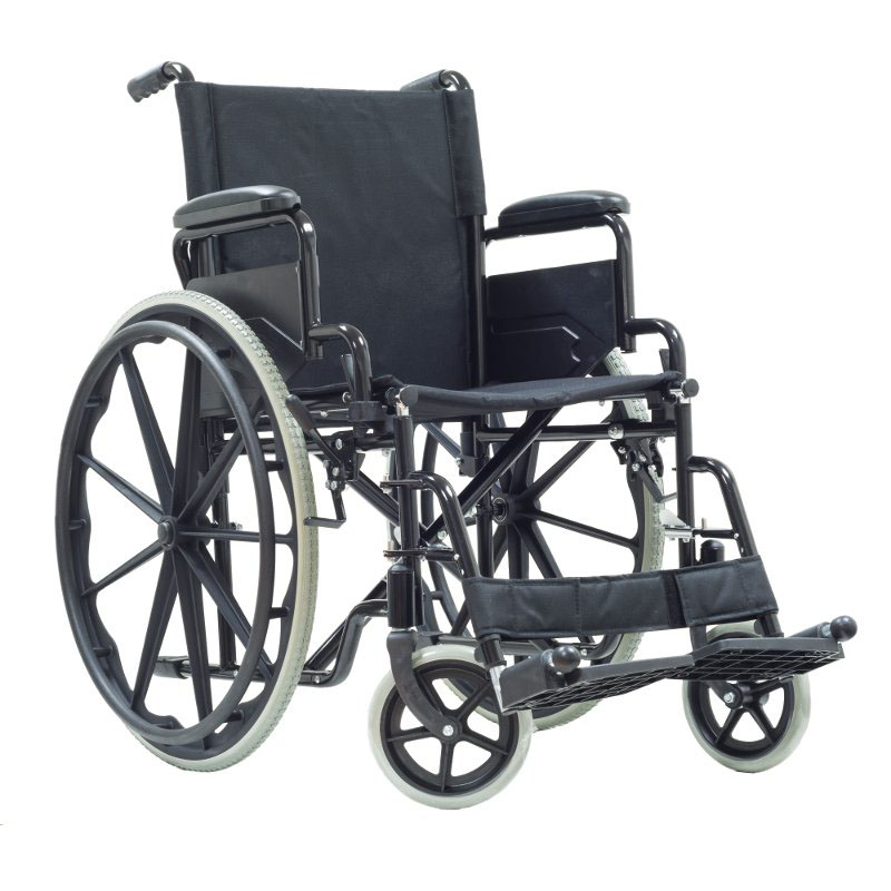 Ruedas traseras de ø600 mm con banda de rodadura de goma maciza color gris antihuella; palanca de freno para su inmovilización, y aro impulsor ergonómico.
