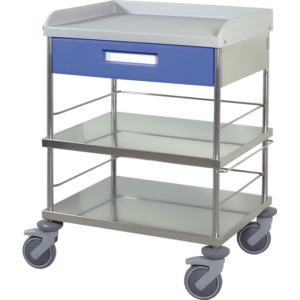 Estante inferior de chapa de acero inoxidable, con barandilla de protección en tres lados.