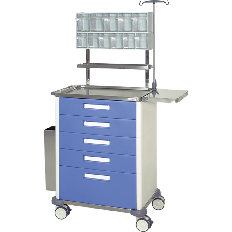 Chariot d’anesthésie avec un tiroir « grand », quatre tiroirs standard » et un plan de travail.